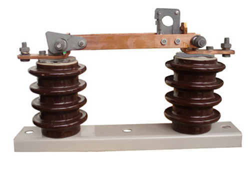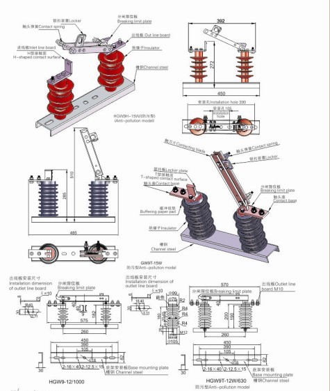 本產品為單斷口垂直打開式結構,單極隔離開關支柱絕緣子安裝在各自底架上,主要由底座、支柱絕緣子、主導電回路部分、自鎖裝置等組成。采用閘刀式結構分合閘達到切斷和閉合線路。每相閘刀由兩片導電刀片組成,刀片兩側外裝有壓縮彈簧,調節彈簧的高度可以得到開關閘刀所需要的接觸壓力。開關分合閘時用絕緣鉤棒操作機構部分,閘刀有自鎖裝置。